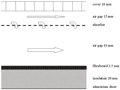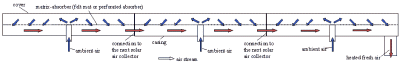 Formålet med dette projekt var at udvikle og teste en ny type luftsolfanger, der let kan klikkes sammen til større felter uden tab af effektivitet. Solfangerpanelet er udviklet af solvarmefirmaet Aidt Miljø A/S. Et solfangerfelt bestående af tre paneler er blevet udviklet, afprøvet og sammenlignet med effektiviteten af to små luftsolfangerpaneler. Opbygning og resultatet af målingerne er beskrevet i rapporten "Connectable solar air collectors" (pdf, 4.895 kb). Herover: princip i de sammenkoblelige luftsolfangerpaneler (klik for større billede).