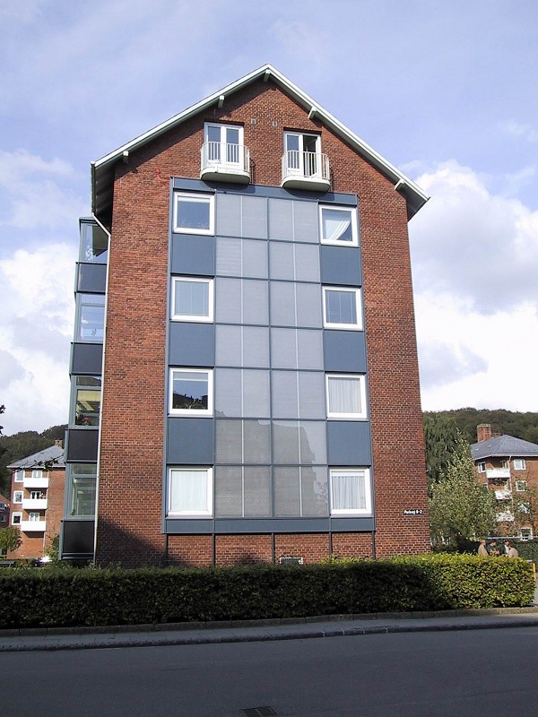 FLEXREN, Vejle - integreret energirenovering af etageboligerProjektet er en efterfølger af EFP-96-projektet "Integreret energirenovering af etageboliger". Formålet med projektet var at tilpasse og demonstrere de mest lovende danske og udenlandske teknikker vedrørende energieffektiv bygningsrenovering med solvarmeudnyttelse. Projektet udgør detailprojektering, realisering, måling og evaluering af renoveringen af afdeling 9 i Boligforeningen Østerbo, Vejle. EuroSun 2000-paper'et "FLEXREN - flexible facade system for energy conscious renovation of European homes" (pdf, 2.835 kb) beskriver intentionerne med projektet. Ud over den traditionelle renovering med nyt køkken, bad og varmesystem, har lejlighederne fået fugtstyret afkastventilation, solkarnapper med luftsolfanger til forvarmning af den friske luft samt massesolvægge på to af de sydvendte gavle. Der blev gennemført målinger på én af bygningerne i perioden marts 2000 - juni 2002. En rapport, der beskriver renoveringstiltagene og resultaterne fra målinger og beregninger, er under udarbejdelse.