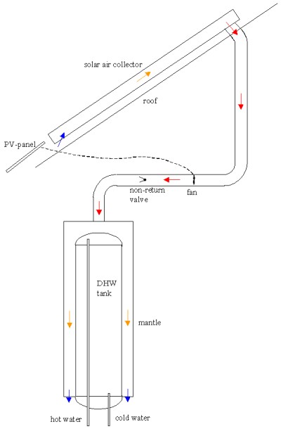Udvikling af kombinerede luft/vand solvarmeanlægSolvarmefirmaet Aidt Miljø A/S har udviklet et lille, billigt luftsolvarmeanlæg, hvor ventilatoren direkte drives af et solcellepanel. Anlægget benyttes primært i sommer- og fritidshuse til at holde husene fugtfrie i vinterhalvåret, hvor de ikke benyttes. Solvarmeanlægget sørger for at blæse tør og varm luft gennem husene, når solen skinner. Herved undgås det at f.eks. sengetøj bliver jordslået og køkkensaltet bliver fugtigt. Men i sommermånederne er der ikke brug for denne opvarmning/udtørring. I stedet er der brug for forvarmning af brugsvand. Formålet med projektet var derfor at udvikle en simpel og billig måde at overføre varmen fra en luftsolfanger til en brugsvandstank. Dette er gjort ved at blæse den varme luft ned over en høj og slank brugsvandstank. For at øge varmeoverføringen er der monteret konvektorribber på brugsvandstanken.