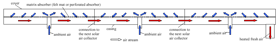 Formålet med dette projekt var at udvikle og teste en ny type luftsolfanger, der let kan klikkes sammen til større felter uden tab af effektivitet. Solfangerpanelet er udviklet af solvarmefirmaet Aidt Miljø A/S. Et solfangerfelt bestående af tre paneler er blevet udviklet, afprøvet og sammenlignet med effektiviteten af to små luftsolfangerpaneler. Opbygning og resultatet af målingerne er beskrevet i rapporten "Connectable solar air collectors" (pdf, 4.895 kb). Herover: princip i de sammenkoblelige luftsolfangerpaneler (klik for større billede).